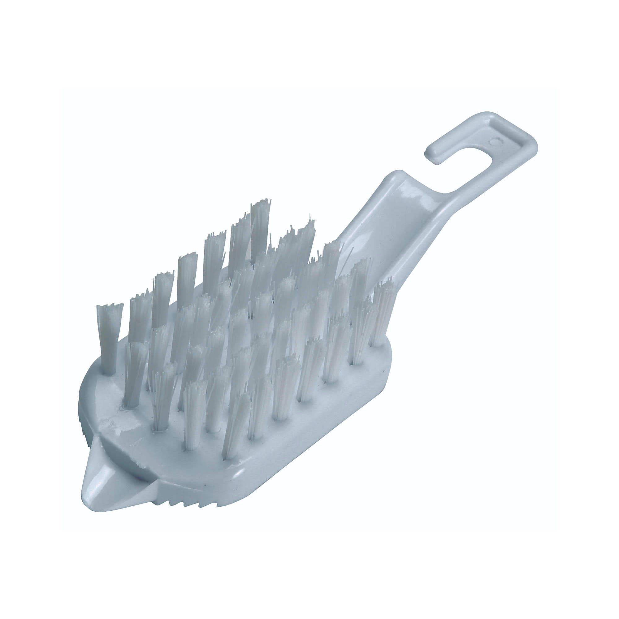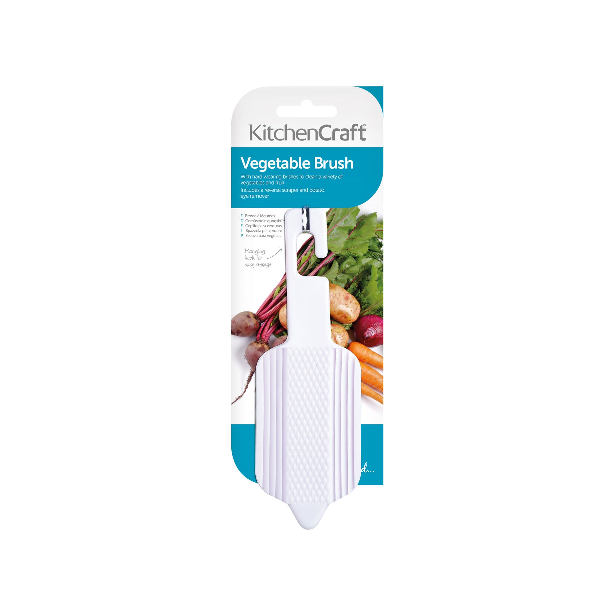 Features hard wearing bristles for cleaning all types of fruit and vegetables, as well as a reverse scraper and potato eye remover. The handle includes a hanging hook for easy storage.