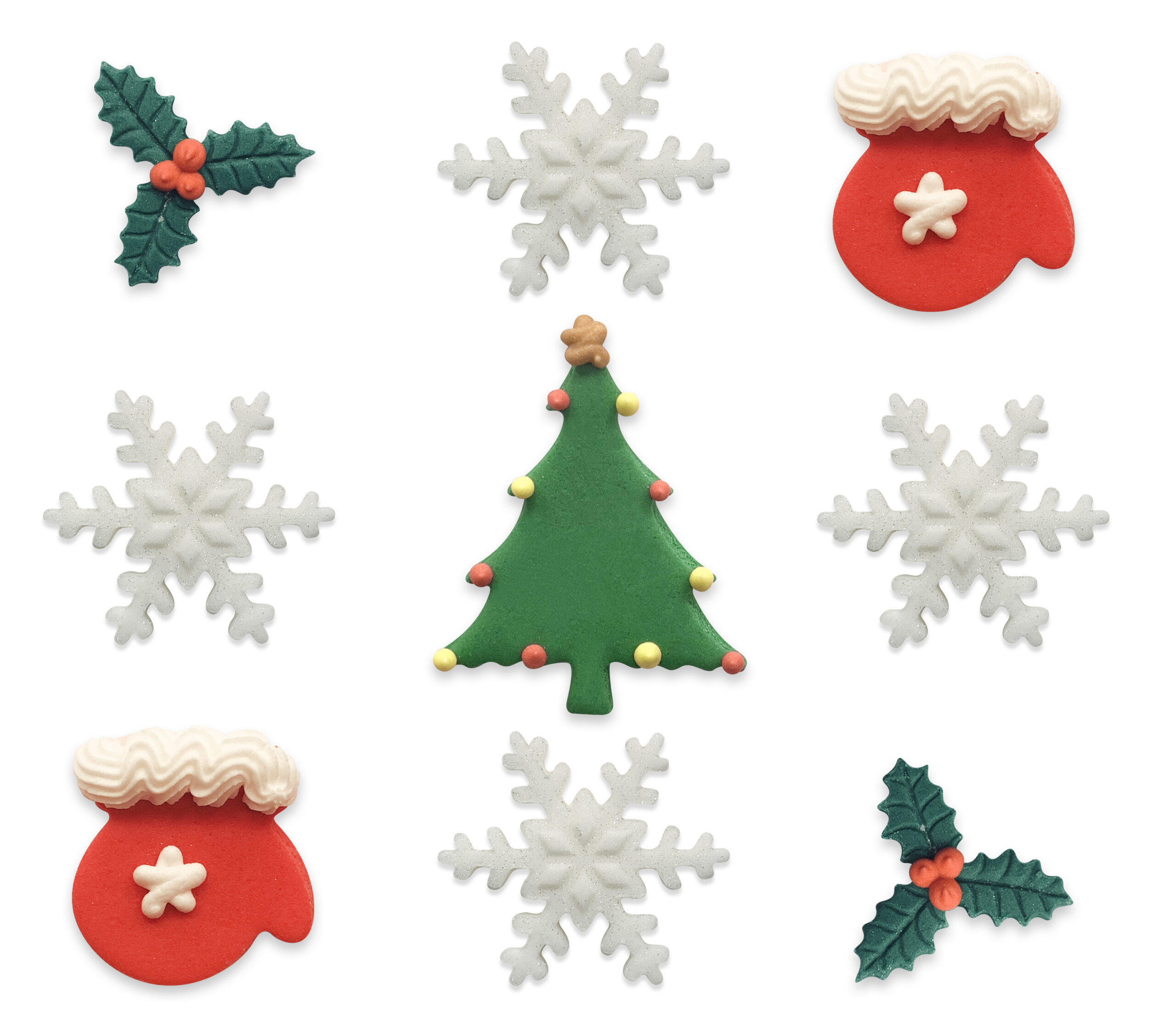 Beautifully handcrafted sugar Christmas toppers ( snowflake, tree, holly, mittens) – perfect for decorating your Christmas bakes !