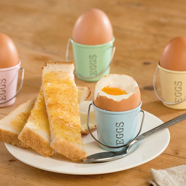 Set of 4 metal egg cups in four pastel shades from Eddingtons, designed to look like small pails.