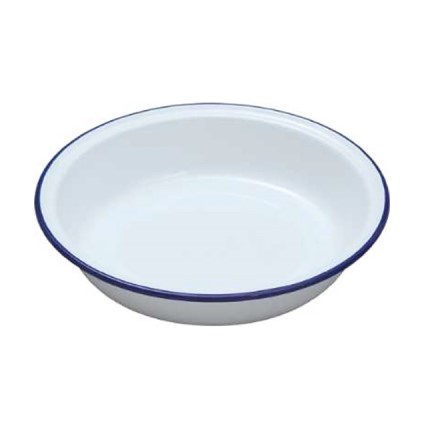 Traditional white enamel pie dish with a blue keyline around the rim