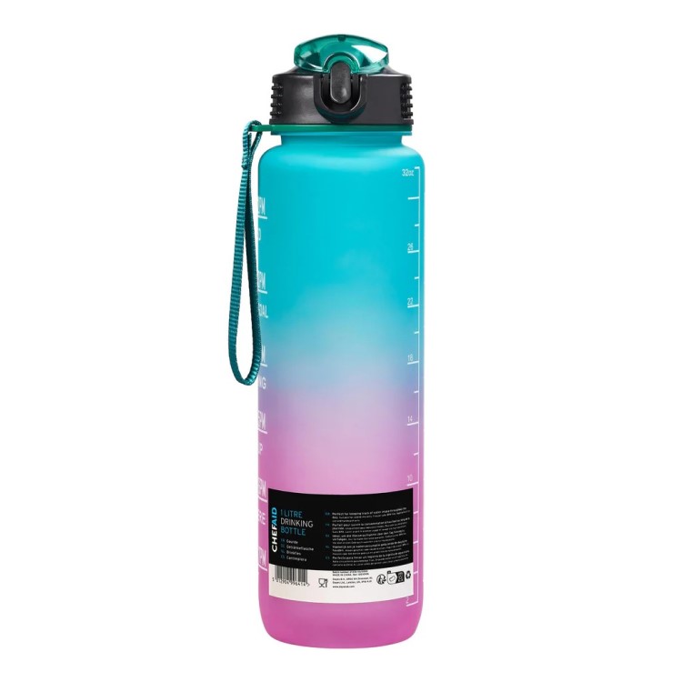 This platic re-hydration bottle includes marked time intervals or goals to help users track their water intake throughout the day. These targets encourage regular drinking to meet daily hydration goals.