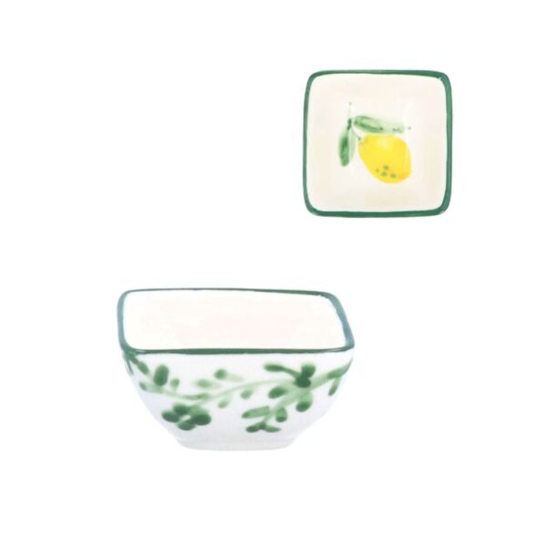 This delightful mini stoneware bowl features a charming lemon design, bringing a touch of artisanal beauty to your table. Its small, squared shape makes it perfect for serving individual portions of dips, sauces, snacks, condiments, or even as a decorative piece.