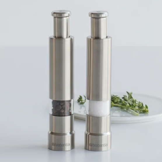 Bring both style and functionality to your table with the Brabantia Profile Salt & Pepper Mills. This elegant set of two mills, crafted from high-quality matt stainless steel and clear acrylic, allows you to freshly grind salt and pepper with ease, enhancing the flavor of every meal.