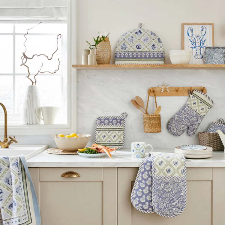 Add a touch of charm to your kitchen with the Coastal Treasures range, a hand-painted design inspired by the timeless elegance of the coastal grandmother trend and the warm, inviting world of a Nancy Meyers. This collection captures the magic of seaside living with a curated mix of motifs like delicate shells, windswept florals, native birds, and whimsical coastal insects each one a nod to the treasures found along the shoreline. Soft tonal blues and seafoam greens echo the hues of the ocean creating a serene palette that’s both nostalgic and modern. Designed with mix-and-match patterns in mind, Coastal Treasures brings together coordinating prints that celebrate individuality while working effortlessly to create perfect, lived-in coastal interiors. Original hand-painted artwork ensures each piece tells a unique story, full of coastal charm and crafted sophistication.