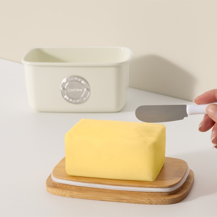 Store and serve your butter with ease thanks to our Living Cream Butter Dish and Spatula Set. Beautifully designed from durable cream-coated carbon steel and sustainable bamboo, this butter dish is not only practical but is sure to add a touch of style to any worktop or dining table.