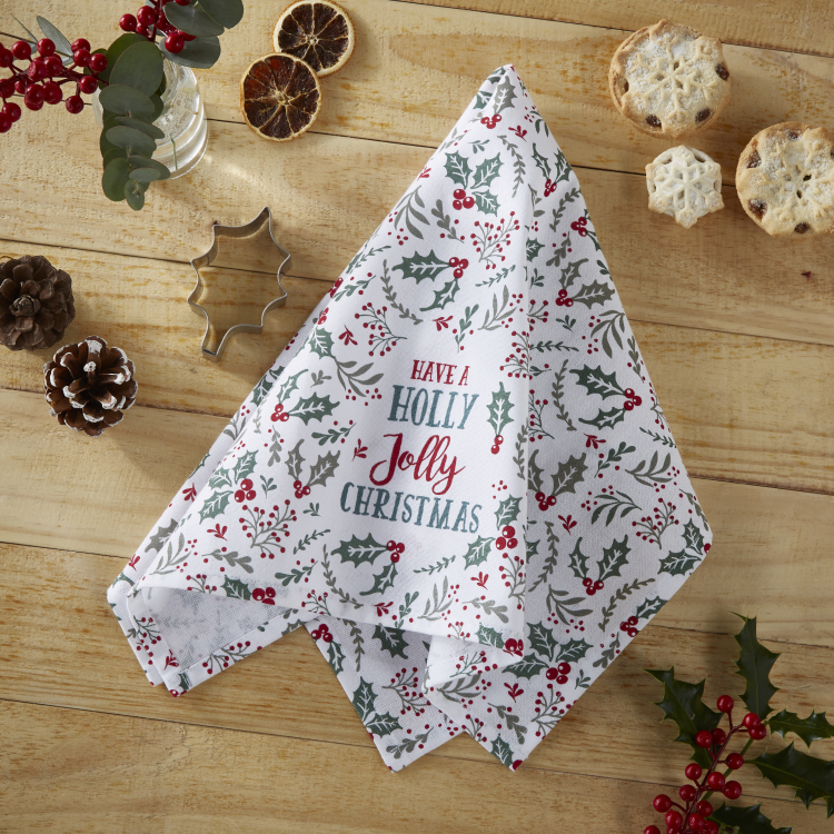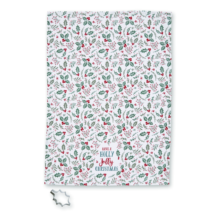 A perfect Christmas tea towel featuring a holly design and the words “Have a holly, jolly Christmas” plus a holly metal cutter (length 10cm)