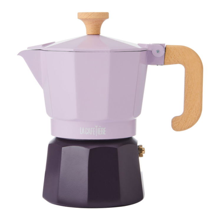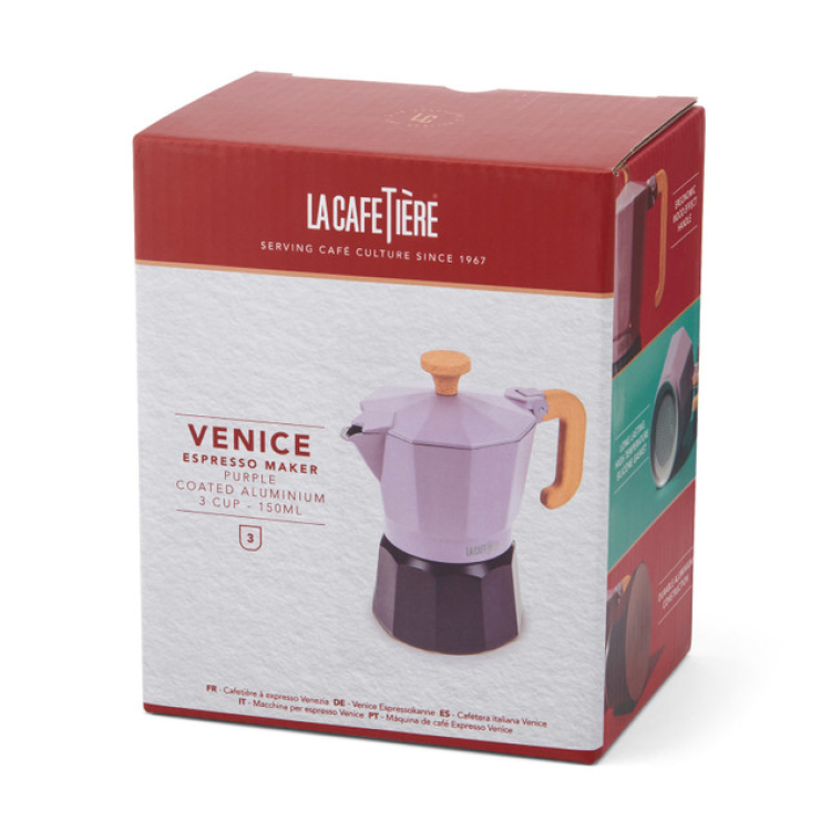 Discover the joy of making traditional espresso with our 3-cup Espresso pot in stunning purple colour. Made from high-quality aluminium, this espresso maker heats up quickly and is compatible with gas, electric, and ceramic hobs, making it versatile for any kitchen setup.Â