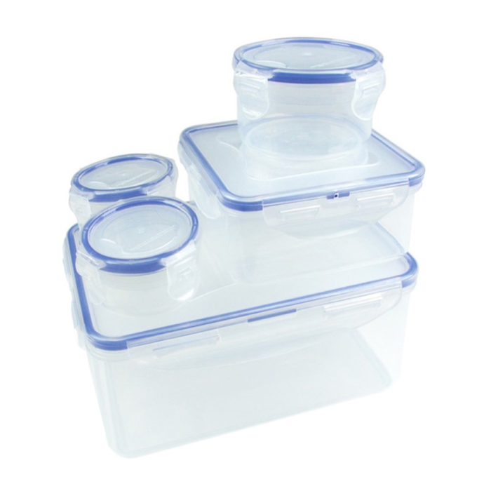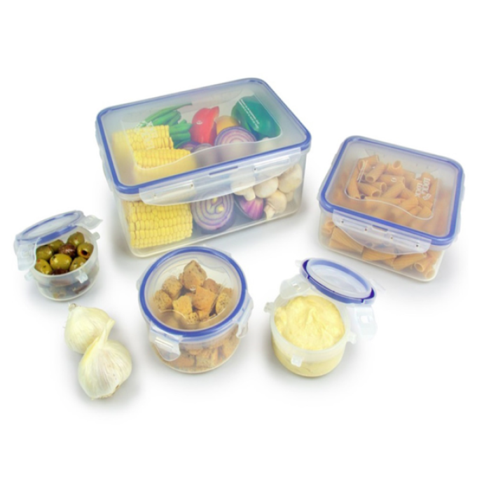 5 piece set contains: 2.6 litre rectangular, 870ml square, 300ml round and x2 x 100ml round