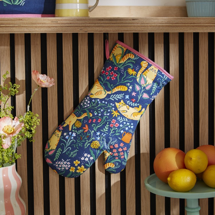 Bring a burst of personality to your home with our Marmalade Meadow range. Featuring graphic ginger cats tumbling through whimsical blooms against a deep navy backdrop, this collection is designed for those who love their decor with a side of fun.