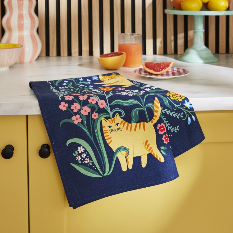Bring a burst of personality to your home with our Marmalade Meadow range. Featuring graphic ginger cats tumbling through whimsical blooms against a deep navy backdrop, this collection is designed for those who love their decor with a side of fun.