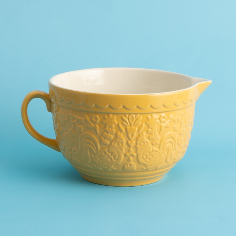 Designed for both beauty and practicality, this batter bowl features the signature folk-art embossing of the “Home to Roost” range. The intricate pattern displays charming hens and floral motifs, offering a tactile grip while you whisk and pour.