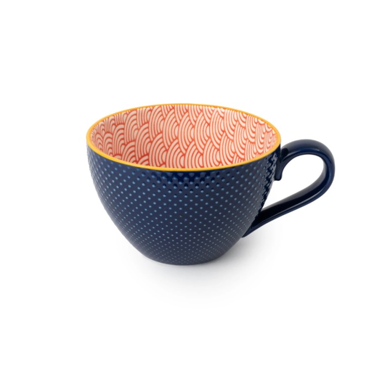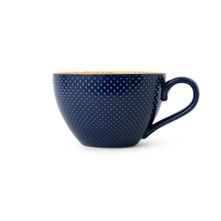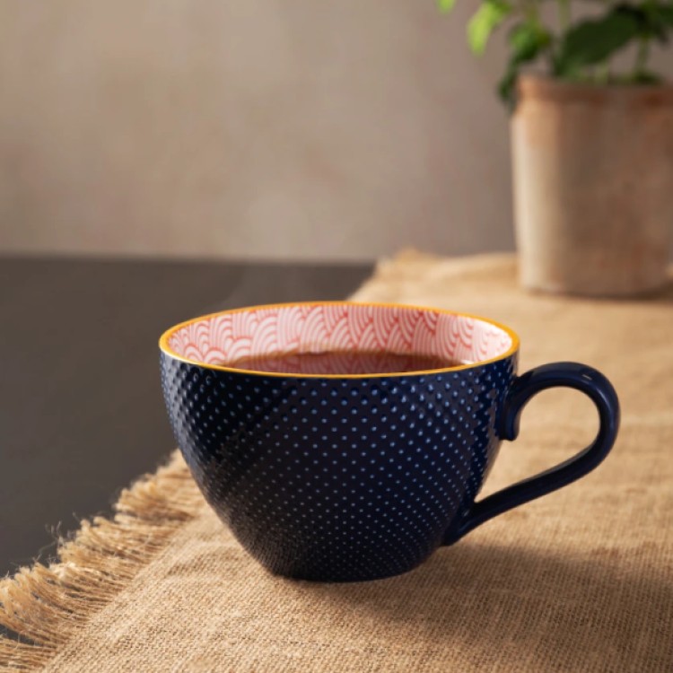 The Mikasa Blue Arched Porcelain Mug brings a sophisticated blend of texture and pattern to your daily drinkware. Designed for those who appreciate fine details, this mug features a stunning contrast between its deep navy exterior and a vibrant, patterned interior.