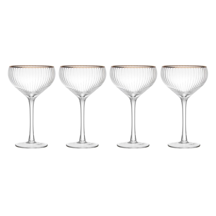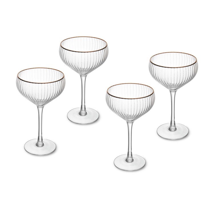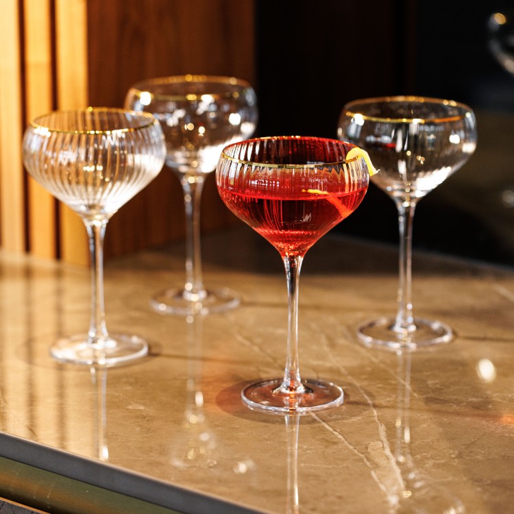 Each coupe glass is crafted with a distinctive, vertical ribbed pattern in perfectly clear, lead-free crystal glass and finished with an opulent gold rim, these glasses cast a subtle glow that is perfect for any special gathering.