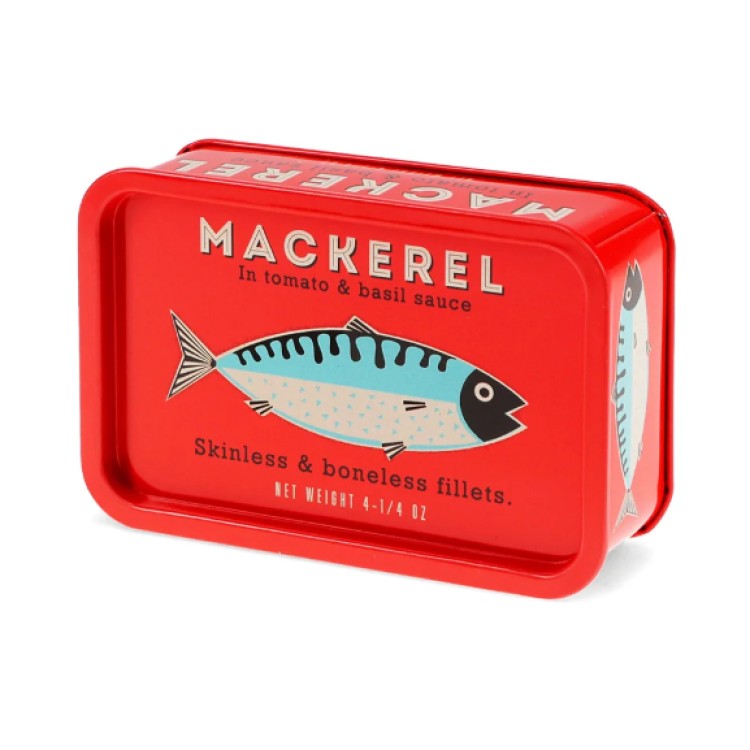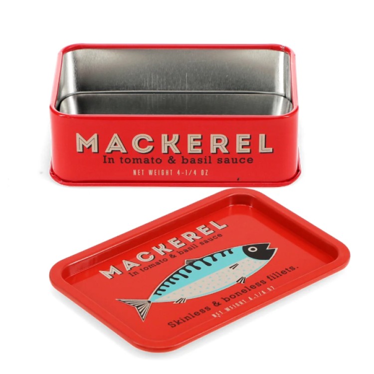 Add a splash of vintage charm to your home with this playful and practical storage tin. Designed to look like a classic retro “Mackerel in Tomato & Basil Sauce” can, this eye-catching red tin is perfect for those who love nautical or kitchen decor.