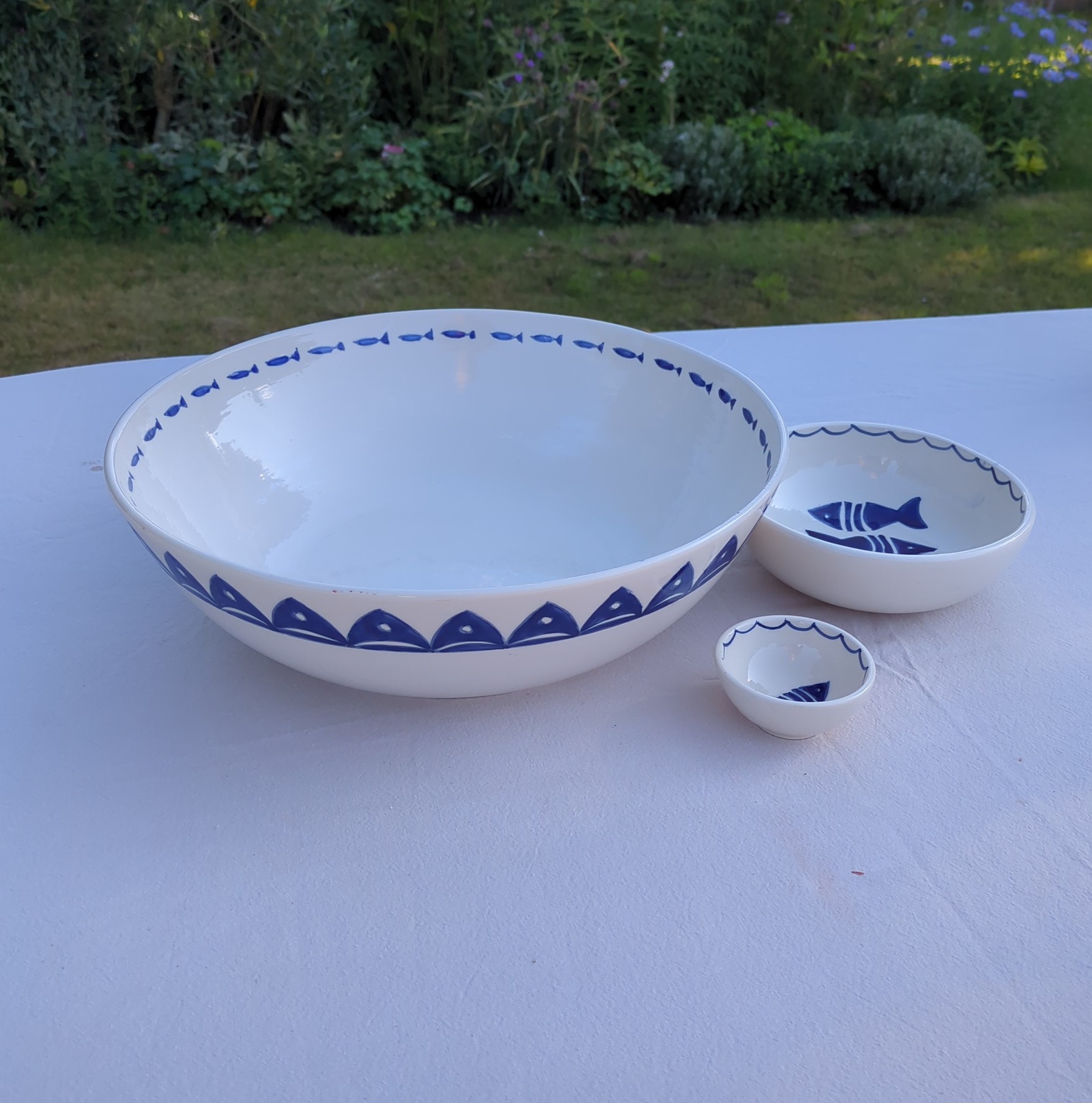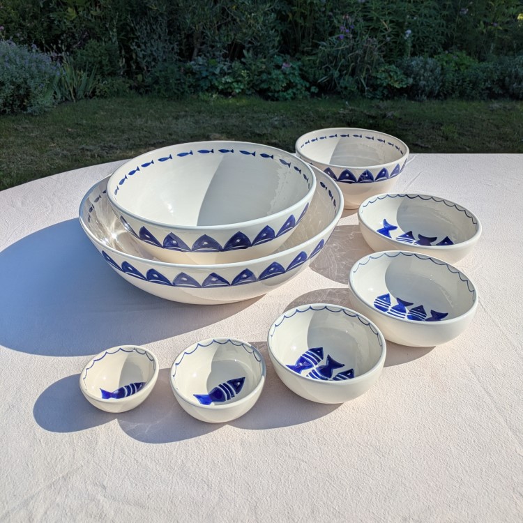 Each piece is meticulously crafted and adorned with playful blue fish motifs, echoing the vibrant marine life of the Mediterranean.