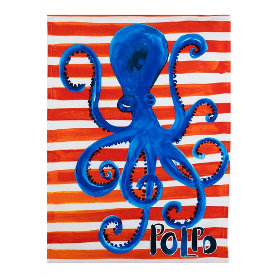 Embrace the bold spirit of the Mediterranean with our Polpo Tea Towel. This striking kitchen essential features a majestic blue octopus or polpo, set against a vibrant backdrop of sun-drenched orange and white nautical stripes. It’s the perfect blend of coastal tradition and modern artistic flair.