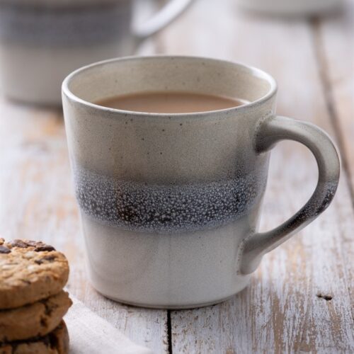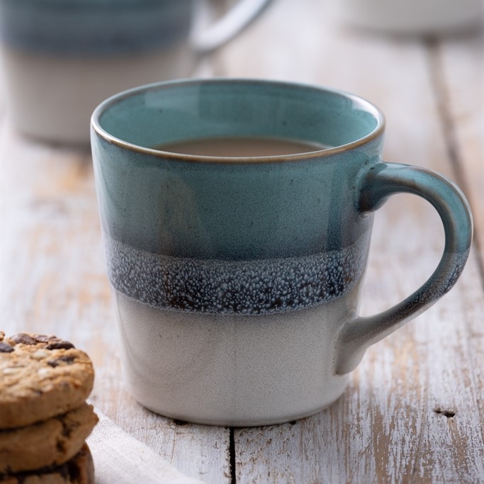Produced using a reactive glaze finish in blue, these stoneware mugs are practical sturdy everyday mugs.