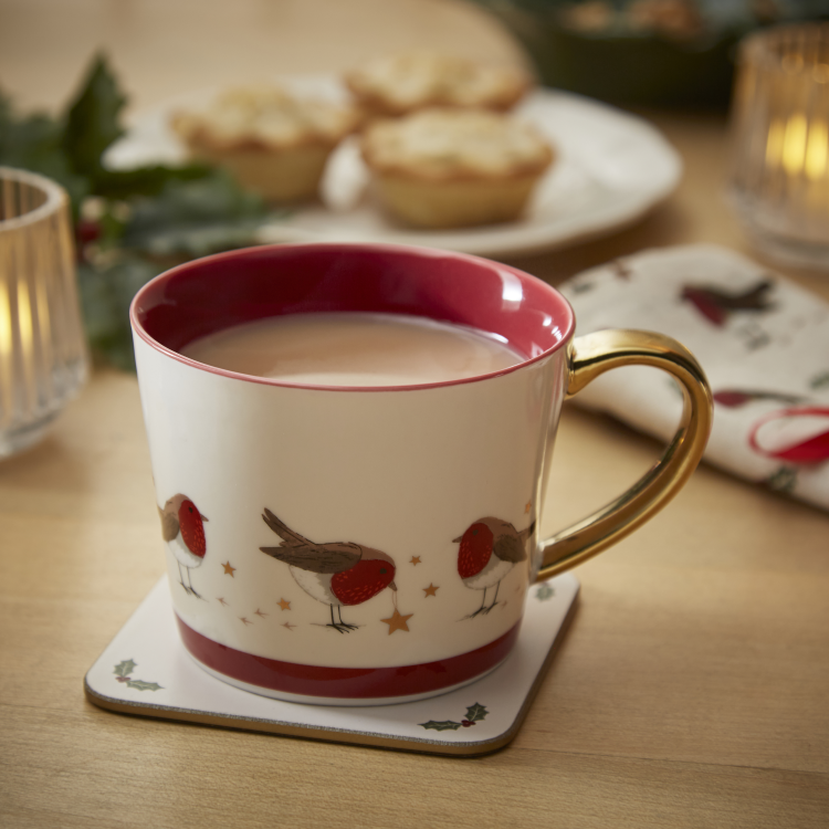 Transform your kitchen and dining space into a cosy, festive haven with the delightful Robins Retreat collection made up of tastefully designed linens, ceramics and table place settings. Inspired by the beloved robin redbreast and the lush greenery of winter, this charming range features a beautifully detailed design of elegant robins, holly leaves, and vibrant red berries on a warm, natural background.