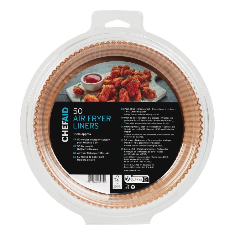 The Chef Aid Round Paper Air Fryer Liners are a kitchen essential designed to aid air-fryer cooking. Designed for convenience these liners are not only oven safe up to 230°C but also suitable for use in the fridge and freezer adding versatility to your meal preparation. Liners sit within the air-fryer tray making cleaning easier. Upgrade your air-frying routine with these reliable and sustainable liners.