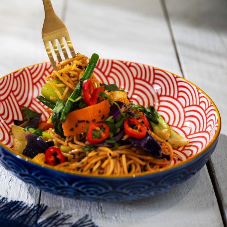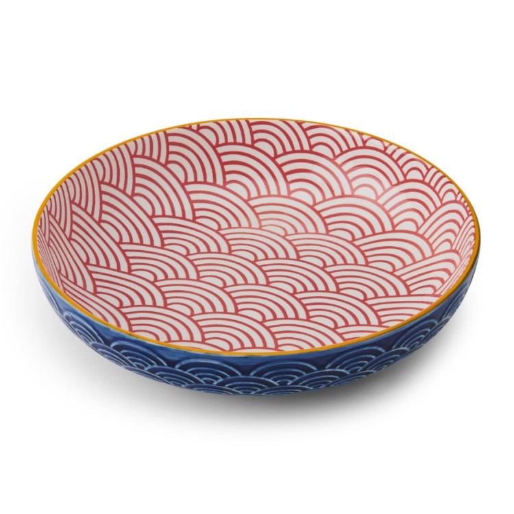 Dive into dynamic design with these Mikasa large shallow bowls, featuring a captivating wave motif that brings a touch of Asian-inspired elegance to your table. The interior showcases a vibrant red and white concentric wave pattern, creating a lively and mesmerizing visual. The exterior complements this beautifully with deep blue embossed waves, all tied together by a slender, cheerful yellow rim. Perfect for serving salads, ramen, pasta, or as a striking decorative piece that adds movement to any setting.