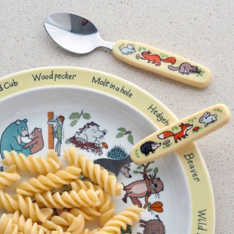 Bring the magic of the forest to the dinner table with this Woodland Friends Cutlery Set by Tyrrell Katz London. Featuring a cast of charming forest creatures, this set is designed to make independent eating an engaging adventure for your little one. The handles are decorated with a delightful array of woodland animals, including a squirrel, beaver, hedgehog, fox, mouse, and rabbit. Featuring chunky, easy-to-grip cream-colored handles and rounded stainless steel edges, these utensils are ideal for small hands developing fine motor skills. The set comes in a sturdy, matching cream-colored storage case with a transparent lid, keeping the cutlery clean in lunchboxes or on travel days.
